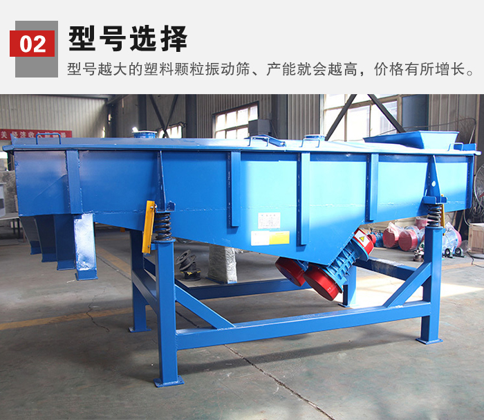 2、型號選擇:各種塑料顆粒振動篩型號多樣,型號越大的塑料顆粒振動篩、產(chǎn)能就會越高,相應的價格也會有所增長。