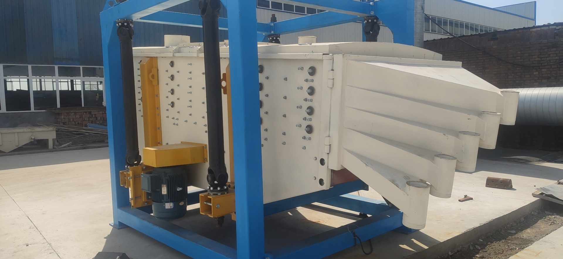 方型搖擺篩利用四根萬向傳動軸把箱體掛在外框架上,通過和變速器、電機(jī)的配合,讓箱體進(jìn)行平面回旋的篩分運(yùn)動,不僅穩(wěn)固,而且美觀大方;